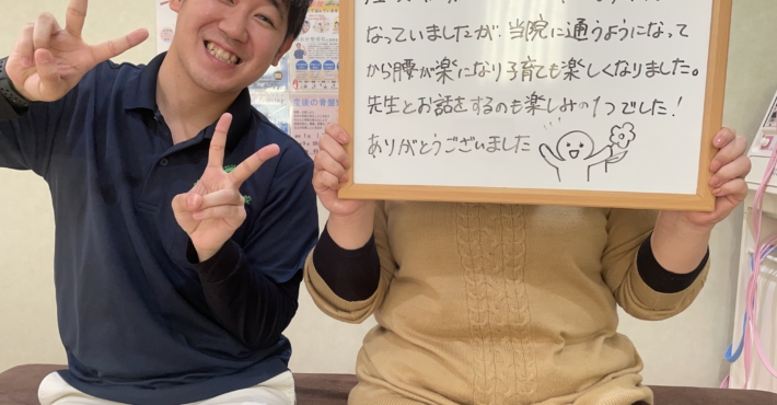子育ても楽しくなりました! 2021年12月17日 S.Mさん腰の痛みがあると子育ても気が重くなりますよね。そんな悩みから解消され、腰の痛みが改善されて本当によかったです!私も施術中の会話をとても楽しませていただきました♪ぜひまた何かありましたら、とめおか整骨院へお越しく...
