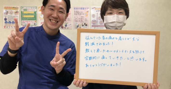首の痛みと肩こりが軽減されました! 2021年5月26日 K.Tさん首の痛みと肩こりが楽になってよかったです!お伝えしたセルフケアをしっかりと行っている結果だと思います!これからも月1回のメンテナンスで今の状態を維持していきましょうね!