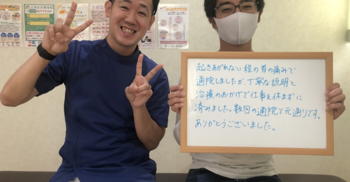 仕事を休まずに痛みが取れました! 2021年3月13日 S.Nさん寝違えで痛みが強く動かすのも辛い状態でしたが、5回の施術で無事完治することができました!ただ、寝違えは癖になりやすいため日々の疲れを溜めないようストレッチなどのケアを忘れないようにしてくださいね!また痛めてしま...